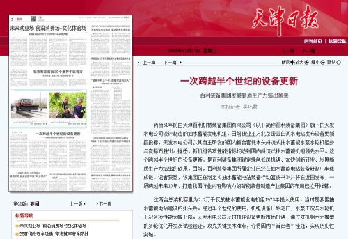 11月27日,《天津日报》刊发了专题报道《一次跨越半个世纪的设备更新 —— 百利装备集团发展新质生产力结出硕果》,报道了百利装备集团锚定绿色低碳机遇,加快创新研发、发展新质生产力结出了新硕果,成功中标北京密云白河水电站设备更新项目,加速抽水蓄能产业链布局,制定《抽水蓄能电站装备行动蓝皮书》,深化与高校、科研院所及行业头部企业合作,形成产业链高质量发展强大合力。