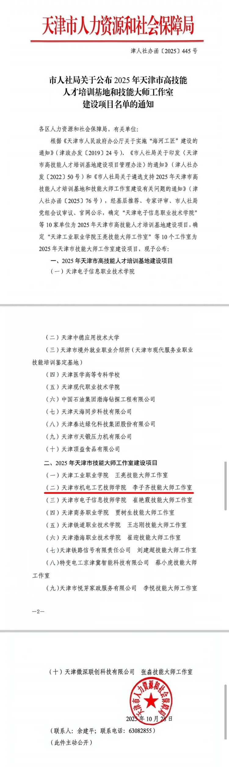 近日,天津市人社局下发了《关于公布2025年天津市高技能人才培训基地和技能大师工作室建设项目名单的通知》,百利装备集团所属天津市机电工艺技师学院(以下简称“工艺学院”)再次获批天津市技能大师工作室——李子齐技能大师工作室。至此,工艺学院已建成3个天津市技能大师工作室。