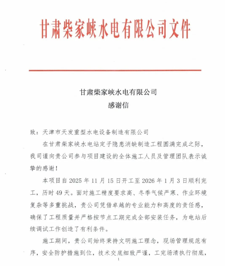 甘肃柴家峡水电站作为国家重点水电工程,四台转轮直径7.2米、单机容量24MW的灯泡贯流式水轮发电机组在区域电力供应、防洪灌溉等方面发挥着不可替代的综合作用。为确保项目顺利推进,天发水电公司组建了专业技术团队驻扎现场开展工作,充分发挥技术协同优势,结合老旧机组的结构特点和实际运行情况,精准把控技术适配性和运行安全性,攻克多个技术难题。改造后的定子设备不仅消除了原有安全隐患,降低了机组能耗,也为电站后续长期安全运行夯实了技术基础。此次改造项目的圆满完成,得到了业主方的高度认可和满意评价,特别送达感谢信对天发水电公司的专业能力和高效服务表示感谢。